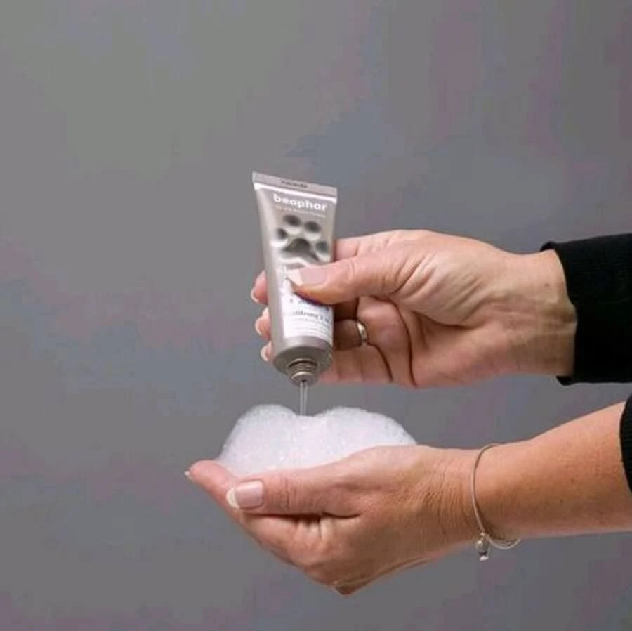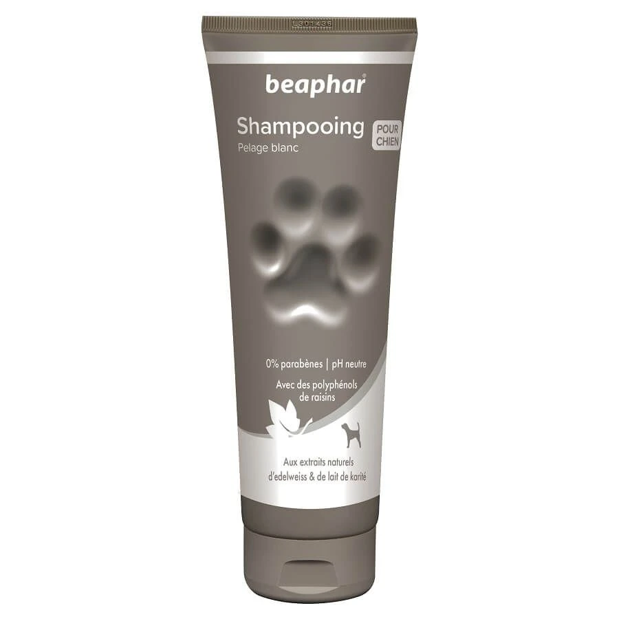 Optez pour un shampoing qui spécifiquement conçu pour le pelage blanc de votre chien. Il se compose d’extraits naturels d’edelweiss et de lait de karité.