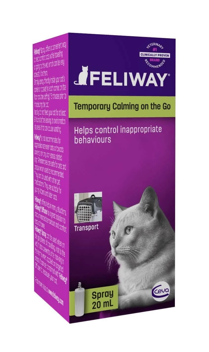 - Lors de vos trajets en voiture ou de vos déplacements chez le vétérinaire, vaporisez le spray Feliway Classic 20ml directement dans la cage de transport ou dans le panier de votre chat.