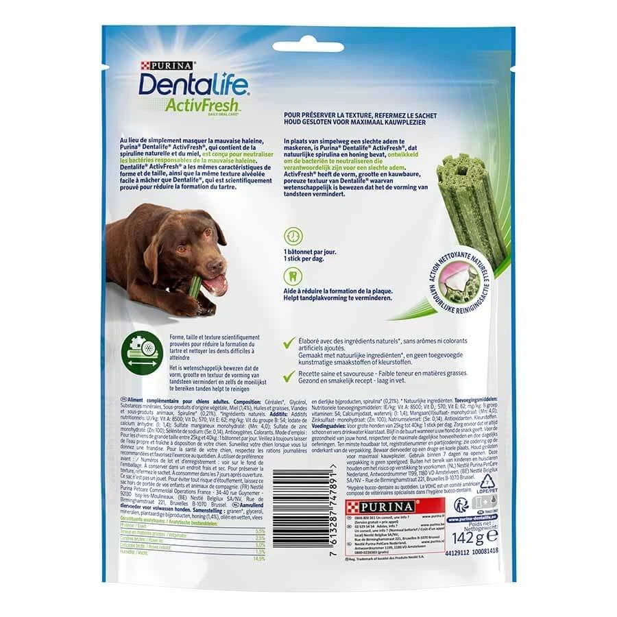 Dentalife Actifresh a les mêmes propriétés que DentaLife. Cette friandise participe à entretenir l’hygiène bucco-dentaire de votre compagnon grâce à sa texture alvéolée facile à mâcher. Ce snack, grâce à ses propriétés innovantes, va cibler les dents les plus difficiles à atteindre qui sont les plus touchées par la formation de tartre et de la plaque. Il a été scientifiquement élaboré afin de réduire la formation de tartre et va aider à réduire la formation de la plaque.