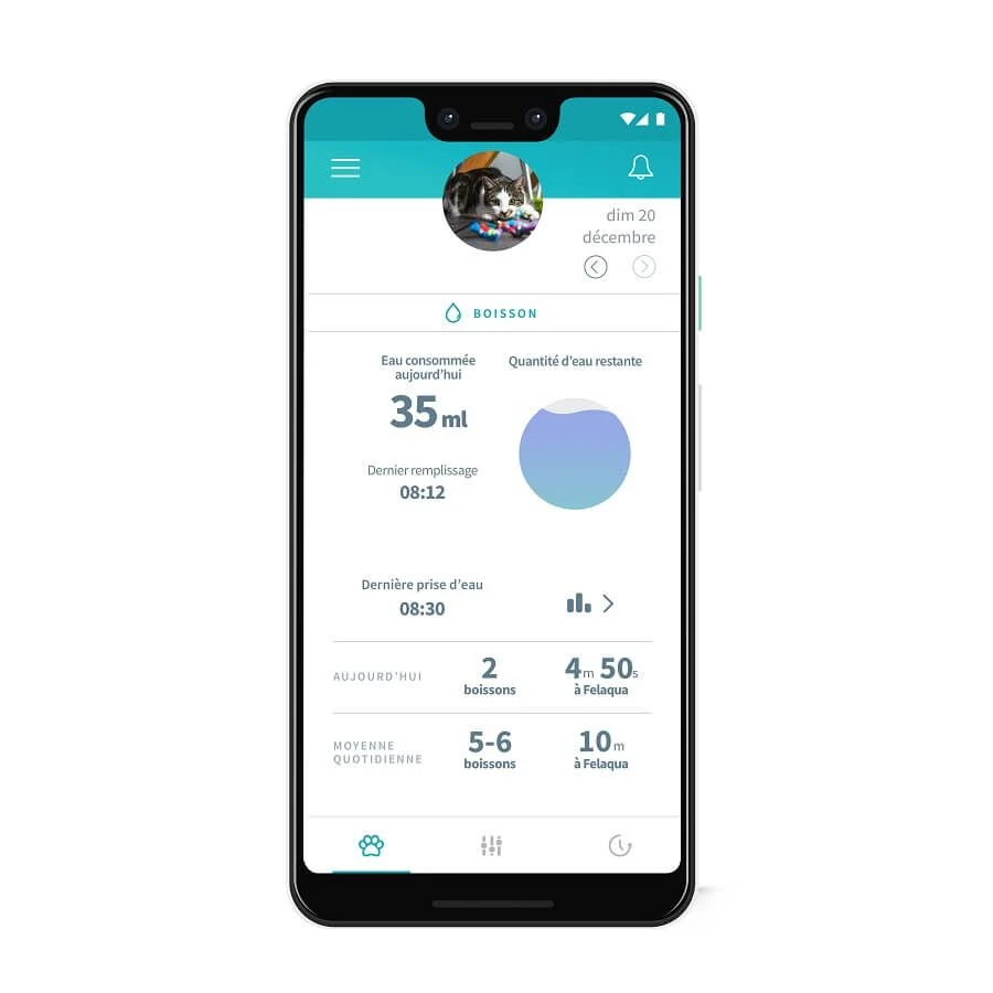 Cet objet connectĂ© est une belle innovation qui permettra en plus de fournir une bonne hydratation Ă votre animal, d’analyser son comportement en vous fournissant des informations directement consultable sur l’application gratuite « Sure Petcare ». Vous pourrez ainsi dĂ©tecter plus rapidement d’Ă©ventuels problèmes rĂ©naux ou urinaires si la consommation d’eau de votre chat change.