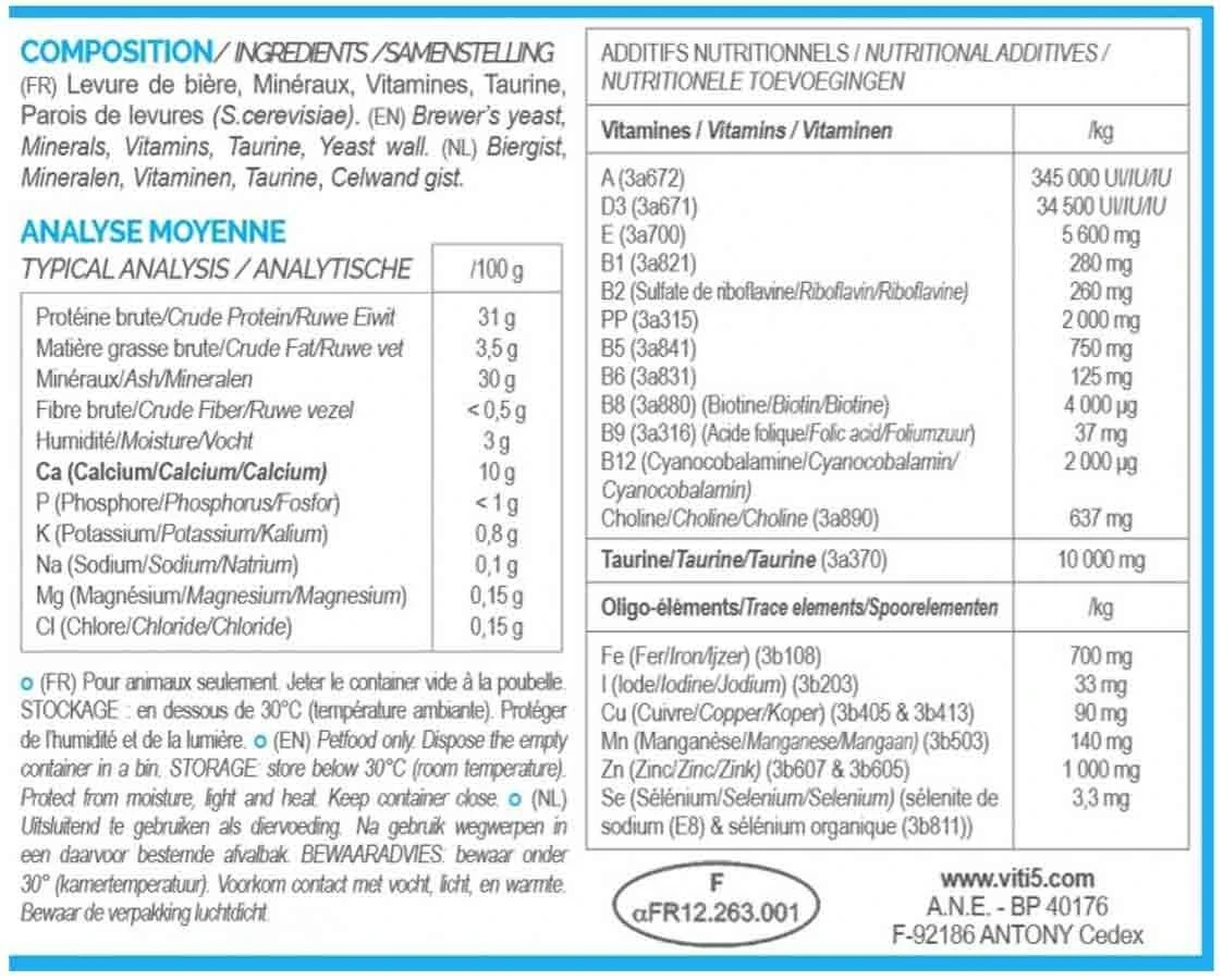 Vit’i5 Bleu est formulĂ© spĂ©cifiquement par notre vĂ©tĂ©rinaire nutritionniste pour Ă©quilibrer en minĂ©raux, vitamines et oligo-Ă©lĂ©ments l’alimentation mĂ©nagère des chiens et chats = viande/poisson + Vit’i5 BLEU + huile de colza + lĂ©gumes +/- fĂ©culent.
