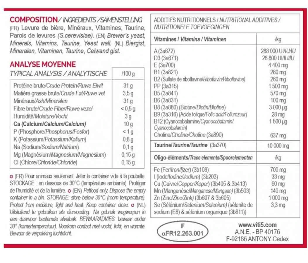 Vit’i5 ROUGE est le seul complĂ©ment avec calcium et sans phosphore formulĂ© pour Ă©quilibrer au mieux :